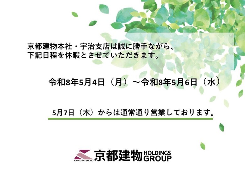 2026/04/27 お知らせ 【ゴールデンウィーク休暇のご案内】 京都建物本社・宇治支店は誠に勝手ながら、 下記期間をゴールデンウィーク休暇とさせていただきます。 ▶GW休暇期間 令和8年5月4日(月)~5月6日(水) 休暇期間中メールでのお問い合わせは受け付けておりますが、 お返事が5月7日(木)以降となりますので、予めご了承くださいませ。 期間中、お客様・お取引先様にはご迷惑をお掛けいたしますが、 何卒よろしくお願い致します。 お知らせ一覧へ戻る